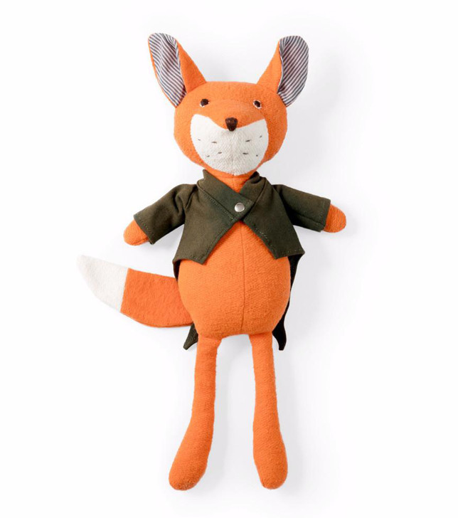 He is made of orange organic cotton fleece, with white fleece on his nose and tail. He measures about 15 inches, ear to toe. He is stuffed with washable fiberfill. His eyes, nose, and whiskers are hand embroidered with cotton thread. His ear linings are gray striped cotton shirting.